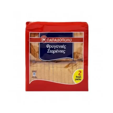 Papadopoulou is een toonaangevend Grieks merk met een lange traditie in bakkerijproducten van hoge kwaliteit. Deze rye rusks (friganies sikalis)