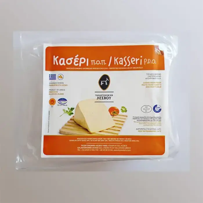 Kaseri uit Lesvos (Mytilini) is een traditionele Griekse halfharde kaas met een beschermde oorsprongsbenaming (P.D.O.), geproduceerd op het eiland Lesvos, waar een lange zuiveltraditie en een rijk, natuurlijk landschap samenkomen. De kaas wordt gemaakt van schapenmelk, soms aangevuld met een kleine hoeveelheid geitenmelk, afkomstig van dieren die vrij grazen op de aromatische kruidenvelden van het eiland. Dit geeft kaseri zijn karakteristieke, licht zoete en boterachtige smaak met subtiele kruidige tonen.