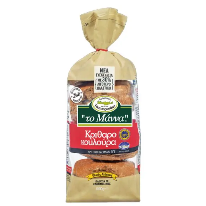To Manna is een Griekse producent die bekend staat om traditionele bakkerijproducten van hoge kwaliteit. Deze kritharokouloura, gemaakt van gerst, worden volgens authentiek recept tweemaal gebakken, wat zorgt voor een stevige, knapperige textuur en een rijke, licht nootachtige smaak. De gerst geeft de rusks een karakteristiek en voedzaam profiel dat perfect past binnen de mediterrane voeding.